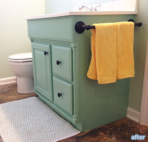 December 18, 2013 at 12:59 PMI need to show this to my mom. She just got a new bathroom faucet (champagne bronze updated from the old brass with chrome handles) and is going to change her light fixture as well. I was telling her she should paint the vanity green (her favorite color, and it would coordinate with her bathroom accessories.) She doesn’t read blogs, so she couldn’t really imagine a green vanity, but this might sway her.