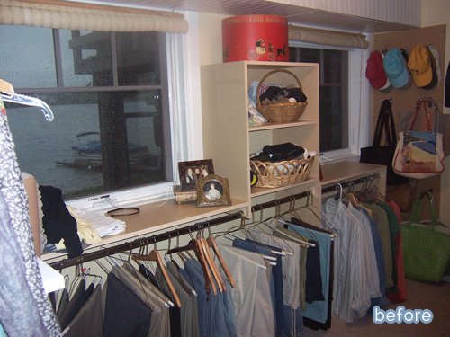 Here’s a hint: the lake! She realized that her closet had one of the best views in the house! Well, that wouldn’t do. I bet those slacks and hats didn’t bother appreciating it one day of their lives.