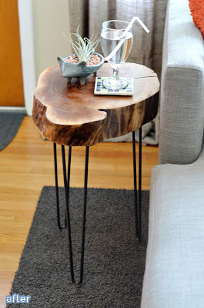 January 9, 2014 at 8:30 AMI am so over the gold-painted tree-trunk table thing but this side table with hairpin legs is cool. It definitely has that MCM vibe.