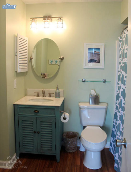 The bathroom got a night-and-day makeover as well. Looks SO much more spacious. I love the colors too, very coastal and calm.