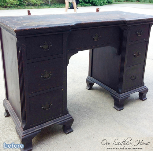 This desk had been the victim of stain abuse at some point in its sad little life. When Christy came upon it for $15 at a yardsale, she had her doubts if it could be saved. Every time she touched it, the old stain rubbed off on her hands, turning them red. (I don’t even understand how this is possible! Who could be so inept at staining? The instructions are right there on the can!)
