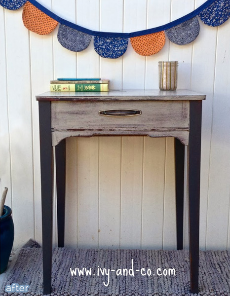 What we DO know is that Becca found it for $5 at a garage sale and decided that even though it couldn’t function as a sewing apparatus any more, it could still be cute. And cute it is! She did a pretty sweet paint technique on it that you can see up close on her blog Ivy and Co.