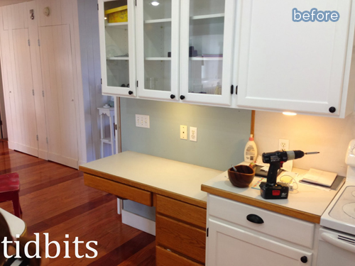 That was the case with her little space here, but one day she decided she couldn’t take any more of its offensive blandness. She painted the maple stained cabinets to match the rest of the kitchen, blocked out the clutter-displaying glass doors with fabric, created a new countertop with wood planks, and added a ton of adorable little details you’ll have to see up close on her blog Tidbits. My favorite (which you can barely see in this picture) are the fancy new legs!