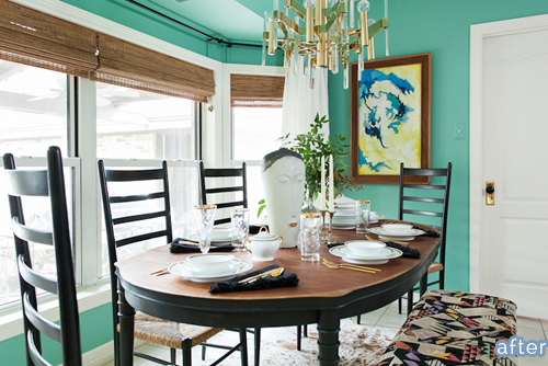 In this case, I prefer the chairs from the ‘before’ pic. Maybe she could get them back. Paint the traditional ones black. Leave the MCM chairs as they are. Not too matchy-matchy. I don’t mean to be critical but I do think that functionality comes before design. But that is my only quibble about this beautiful room.