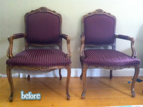 Straight off the set of a ’70s sitcom, this chair and it’s grungy fabric had clearly seen lots of Good Times and Happy Days. But if Dena wanted to keep it All In The Family, that crusty velvet had to go. (I would insert a joke about M*A*S*H here, but I never actually watched that show. That theme song has to be the most depressing sound in human history. I can’t lunge for the mute button fast enough). (Ok, I just googled it and learned that the name of the song is – no joke – Suicide Is Painless. Does it really say that in the song somewhere? I wouldn’t know. I’ve never made it past the first eight notes).