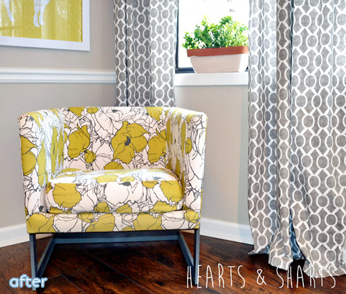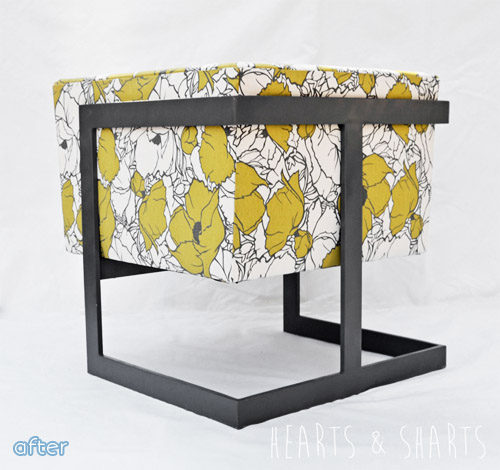 AAAAAnyway, the point is, this cute little cube chair deserved better. Dena took it back to its funkadelic roots with a fabulous floral, and you should check out her blog Hearts and Sharts to see it in its heyday on The Jefferson’s!
