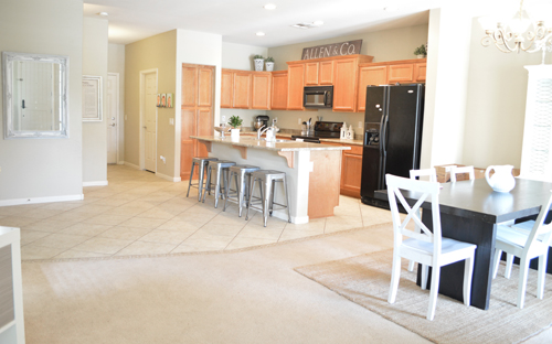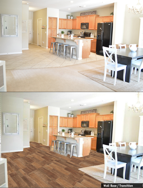 Here’s the fun part. From there, you can upload a picture of your room to RoomVue, their online room visualizer. It’s so fun! I’ve been playing around with the kitchen/dining area of the home we’re renting now. As you can see, it has one of my biggest pet peeves: split flooring. I hate how this forces you to separate the rooms along that exact line.
