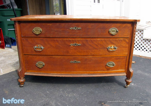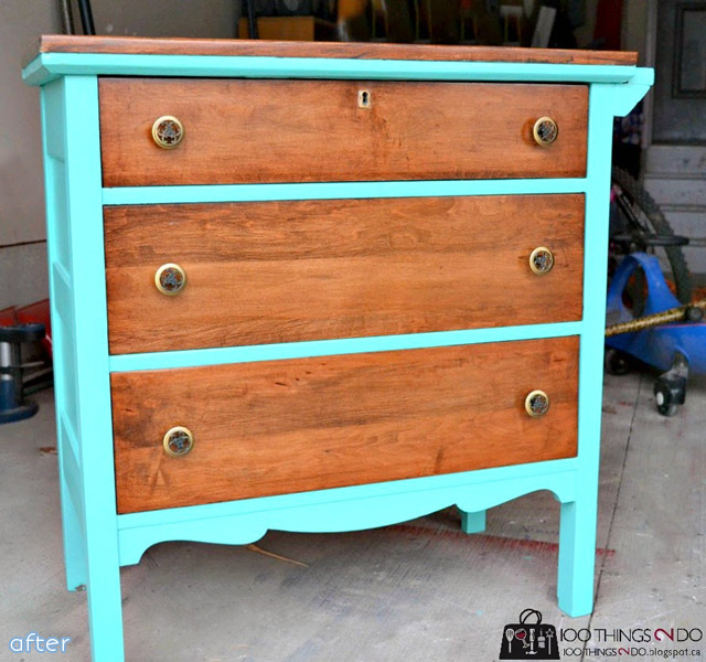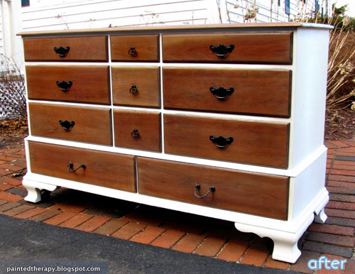 Love the look of refinished wood, but don’t want to commit to an entire dresser? Just do the easy part: the flat stuff! From Debbie at Painted Therapy.