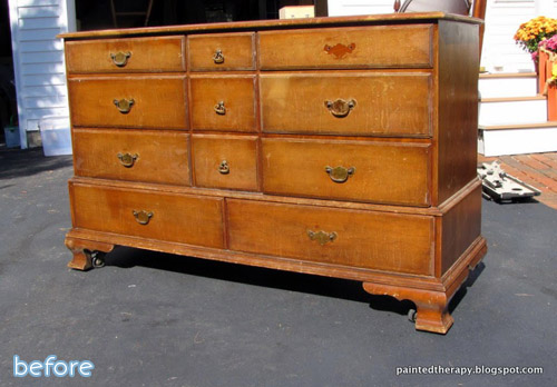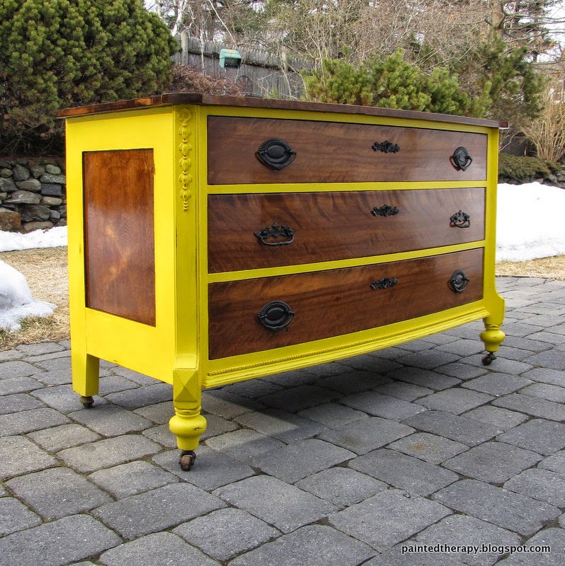 Here’s another from Debbie. This time she coaxed even more glorious grain out of the drawer fronts, and jazzed up the frame with yellow. If someone explained this to me, I would be like … hmm, I don’t know about that, but when my eyeballs see it, they’re like, “YES! I get it!” I love the darker color on the handles too, a very cool look. See it at Painted Therapy.