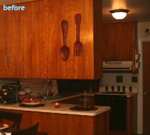 May 9, 2014 at 7:35 AMA huge set of funky wooden tableware does not redeem those ugly overhead cabinets that closed off the before kitchen. The open look of the after is MUCH better. I like that Kayla seems to have worked with her original cabinets otherwise–nice to keep them out of a landfill and in good use.