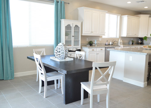 Here is a mishmash of furniture that won’t be staying in this space. I’m on the hunt for a round table that can seat six that doesn’t cost triple the mortgage. This is proving very impossible to find. Also, the teal curtains were an experiment, and not likely to be hanging around much longer. (Heh heh, see what I did there?)