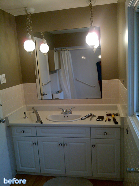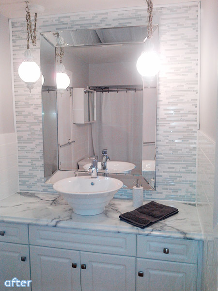 Much like the nerdy girl in the movies who simply has to remove her glasses to become a total babe, this bathroom was a secret beauty as well. Marissa simply added a few cosmetic touches: new mirror, counter and sink, plus a super stunning tiled wall, and POOF! Her bathroom is totally the prom queen.