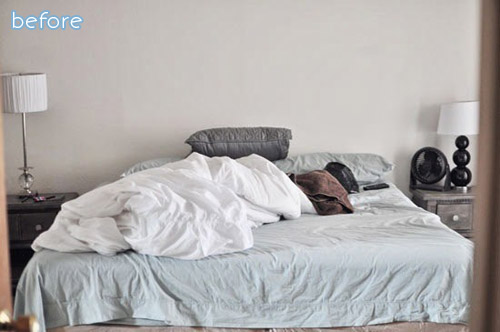 But not yet! Because right now my bedroom looks exactly like Monica’s before bedroom. Actually, mine looks worse. So let’s enjoy her beautiful bedroom makeover instead, while I try to forget that mine is buried somewhere under piles of moving detritus. Love those stripes and the large-and-in-charge headboard. Great way to make use of all that wall space.