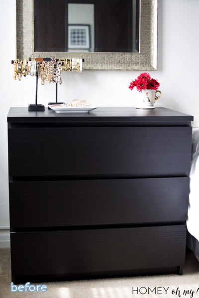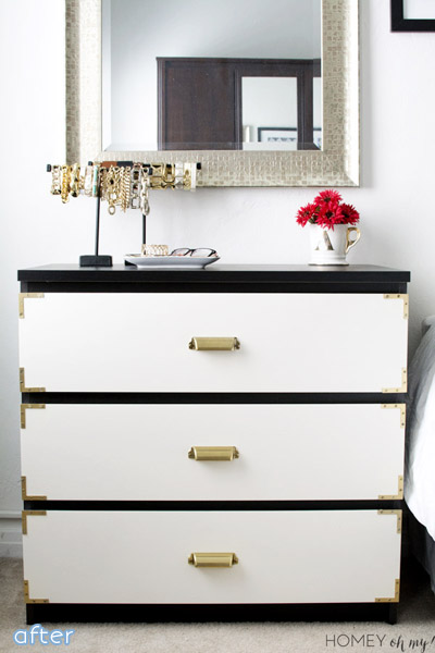 But Amy at Homey Oh My! had an easy solution for this tragic case of the bores: add brass hardware to give it some campaign style! You can get the MALM in white or black, but I love how she painted the black drawer fronts white, leaving a border of black all around. So schnazzy.