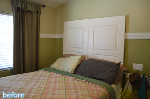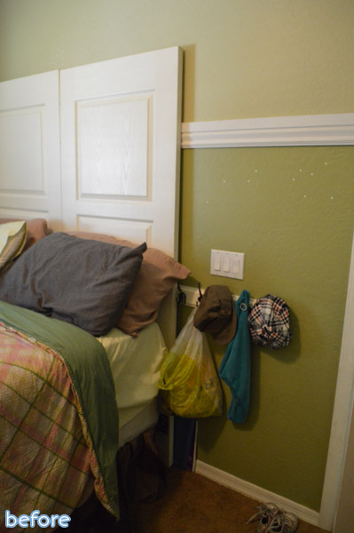So my quickly-formed plan consisted of definitely painting over all that green, and moving the bed so it would be on the wall that faces the door. Jessi had taken the doors off her closet and was using them as a makeshift headboard, so I knew for sure I wanted to make her a headboard as well.