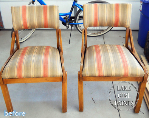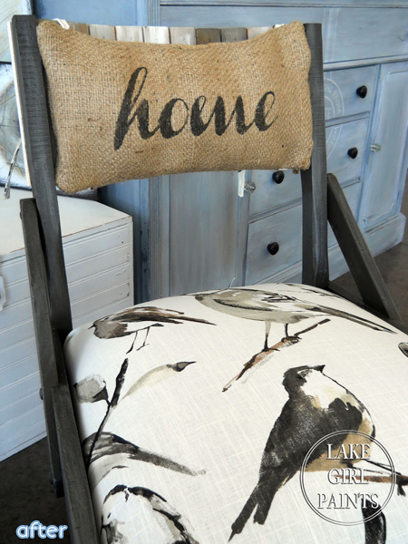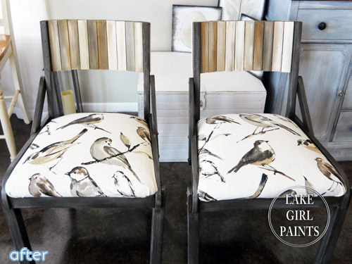 Deb at Lake Girl Paints decided to replace the padding on the backs of these chairs with individually painted strips of lath board instead. Ooooh, great effect. Don’t worry though, she didn’t sacrifice comfort, she made removable pillows too! Love that birdwatcher fabric as well. Fabulous job ladies!