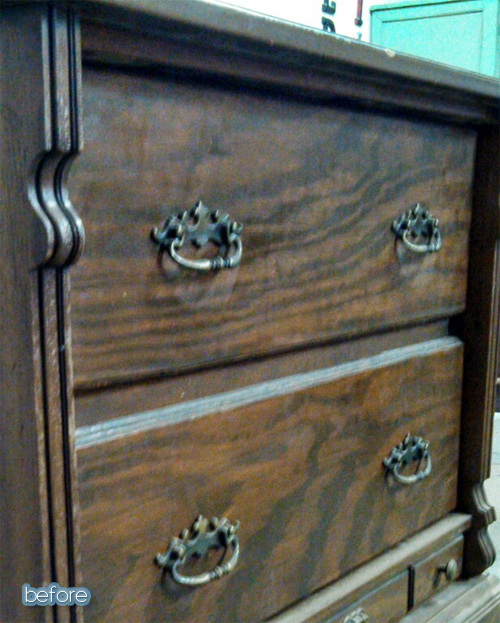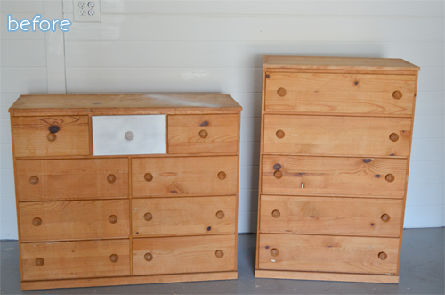 Lindsey (not me, another, more productive Lindsey) had a solid set of dressers on her hands that she found at a yard sale. It appears that someone at one point had attempted to spray-paint them white, then, realizing that pressing a button for 10 seconds at a time was far too much work, gave up, leaving behind one white drawer front and a half-hearted streak across the top. Wow, that person is even worse than me.