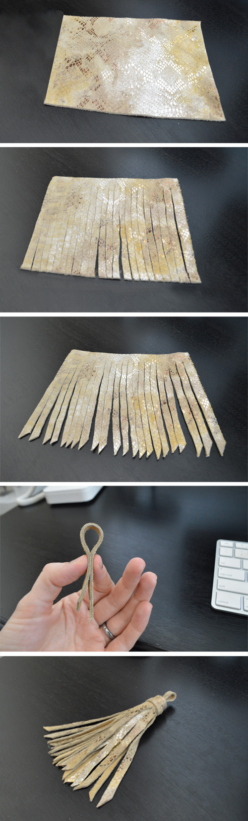 1: Cut strips in the leather, leaving about 1/2 inch space at the top. (Don’t stress yourself out making it perfect).