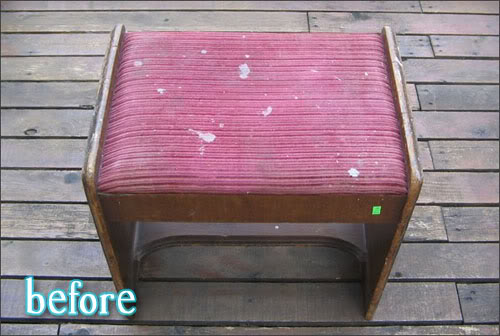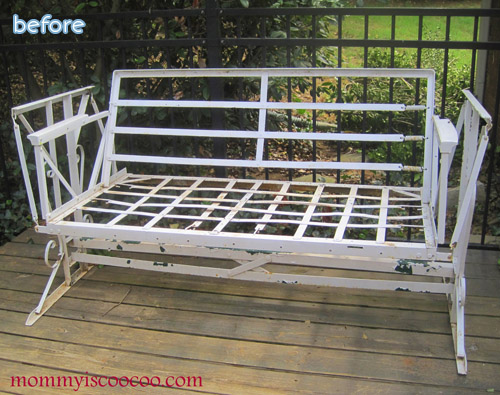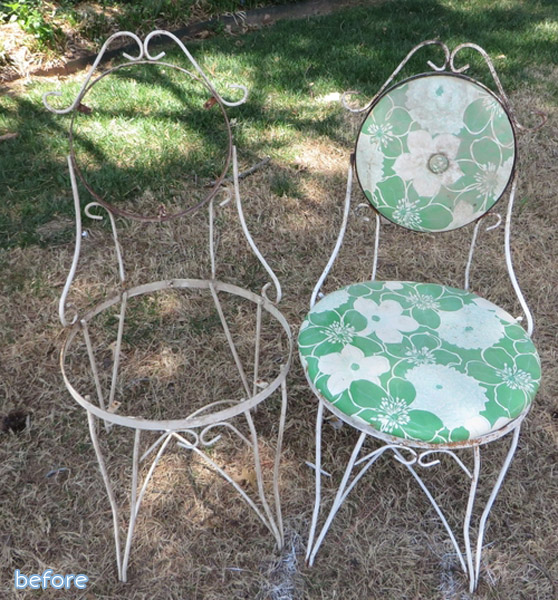 First from Amanda at Mommy is Coocoo who salvaged this vintage chair. I’m all for a weathered patina, but this thing looked like it had fought in the war. Of 1812. At least none of the neighbors were likely to steal it, so it had that going for it. Much better in a shiny coat of red though, I’d say.