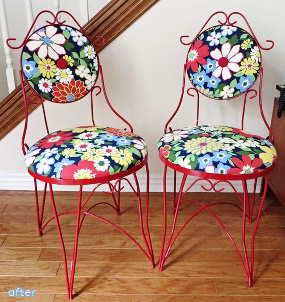 These chairs were somewhat depressing. The left one looks like it’s using an invisibility cloak to avoid being seen. But our hero Red Spray Paint came to the rescue again with his trusty sidekick Snazzy Fabric, and they saved the day, nay, the whole summer! Hooray! From Beck at Beckwith’s Treasures.