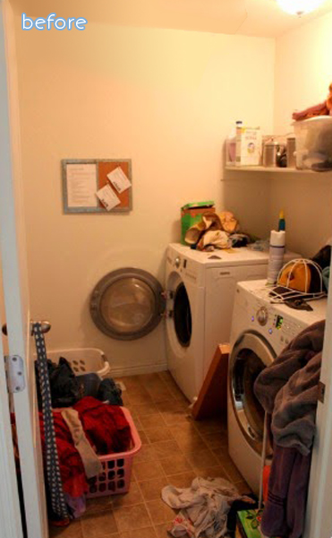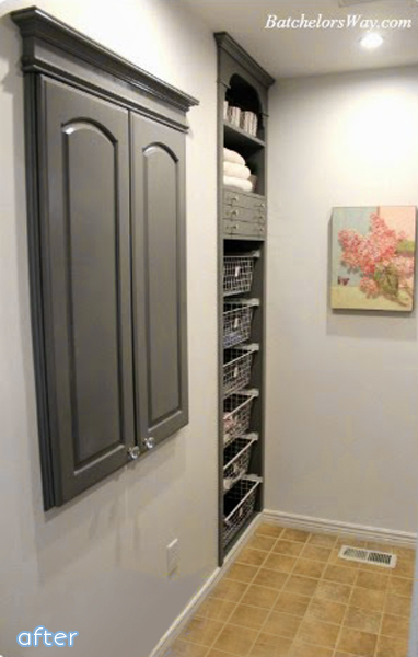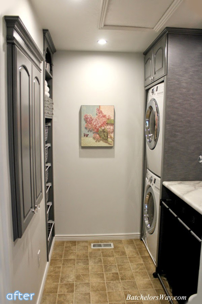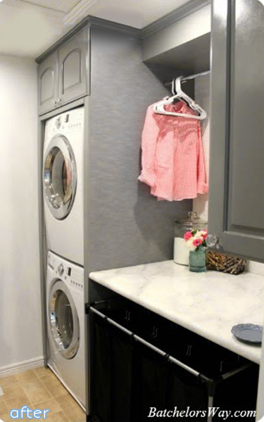 Wow, sorry for that laundry opus. Are you still with me? Hope so. Here’s a fabulous laundry room makeover from Ronda at Batchelors Way. My favorite part: the huge built-in laundry cubby!