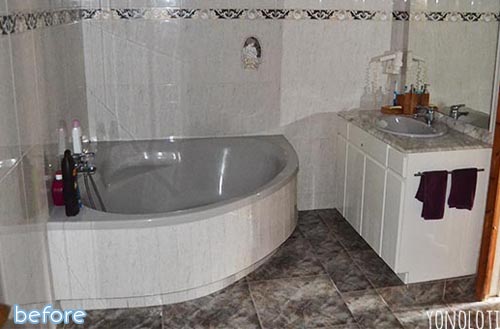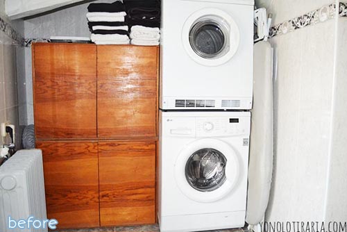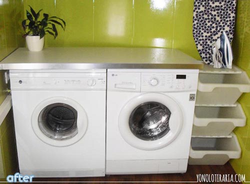 August 14, 2014 at 10:10 AMThis is a most EXCELLENT After! First of all, I LOVE the lime on the walls and tub surround! And at first I thought that the tub had been re-done but now I realize that it’s the same grey that it was originally–but that’s okay! And secondly, what a perfect place to have the laundry–in the room where you remove the majority of what you have to wash anyway! Genius! And the appliances look happier and more function-friendly (to provide a folding surface). Great job, Javier!