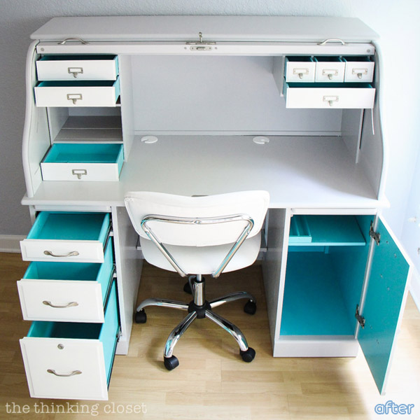 The roll-top desk is time-proven classic, but what’s the harm in updating one to look more modern? None! Absolutely no harm at all. Other than the fact that I bet Lauren shed real tears by the time she was done with hers, because painting three colors on this desk had to have taken F-O-R-E-V-E-R.