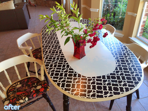 First up, this example from Better After reader Liz, who sent in this stenciled table makeover, explaining that she inherited it from the grandmother of a close friend who she cared for while she was in nursing school. Her instructions were to do anything she wished with it, as long as she didn’t give it away.