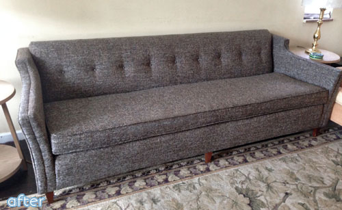 But now it’s not even a ghost of its former Saran-Wrapped self. Better After reader Donna reupholstered it in gray, and get this, it’s only her SECOND TIME REUPHOLSTERING. Ever. Yeah. She taught herself by watching YouTube. She rocks. I have a friend who taught himself how to be a beekeeper by watching YouTube, and now he has a successful bee removal business.