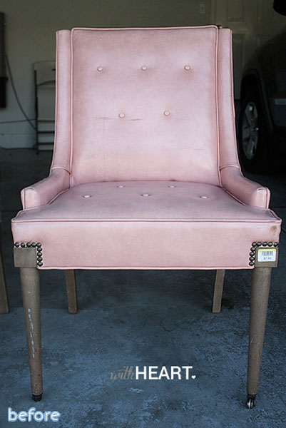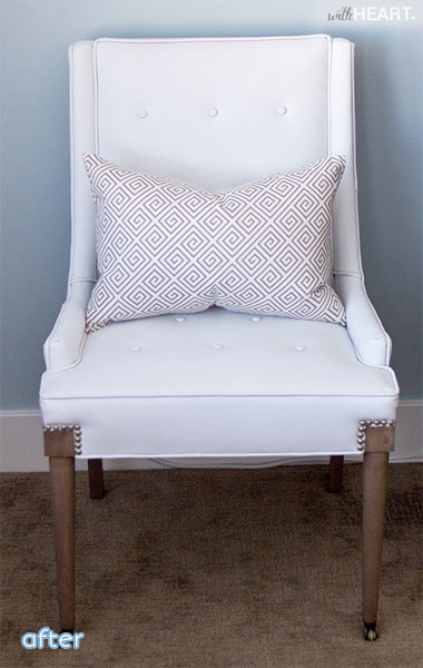 And I love, love this vinyl chair transformation from Jenn at With Heart via Create/Enjoy. The pink was cute but unsalvageable, so after a little trial and error, she found the perfect white to show off those lines and nailhead details. Best part: it has a twin! Other best part: they were only $8 a piece!