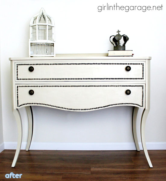 And here comes some makeover goodness your way, nailhead-style! First from Jen at Girl in the Garage, who nailed it (hA!) with this cream vanity.