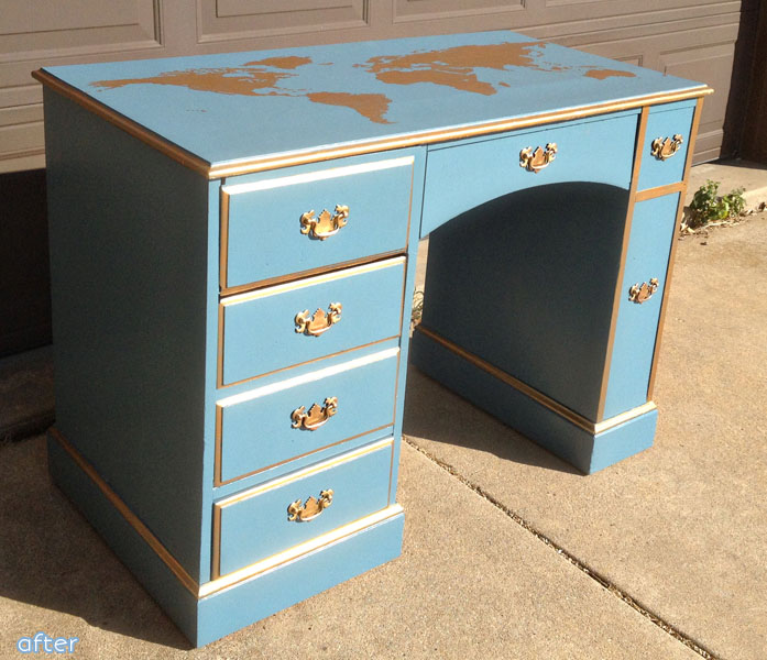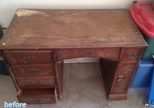 And Better After reader Sarah spent many hours slaving away over this $3 yard-sale desk, only to finish and spend many more hours slaving away at it; as she’s in her fifth and final year of graduate school.