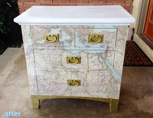 Better After reader Teresa created this nightstand from a curbside dresser and a spare map of Northern Africa that she happened to have on hand. I mean, who doesn’t have a few of those on hand? I’ve actually been meaning to organize my spare maps of Northern Africa drawer, now that you mention it.
