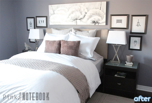 If you feel like crawling back into bed too, here’s a lovely bedroom makeover from Sabrina to tickle your eyeballs. Sometimes bigger isn’t better. She reduced the girth of that headboard by removing the panels attached to the nightstands, and it really lightens up the room even with a darker paint color on the walls. Love it.