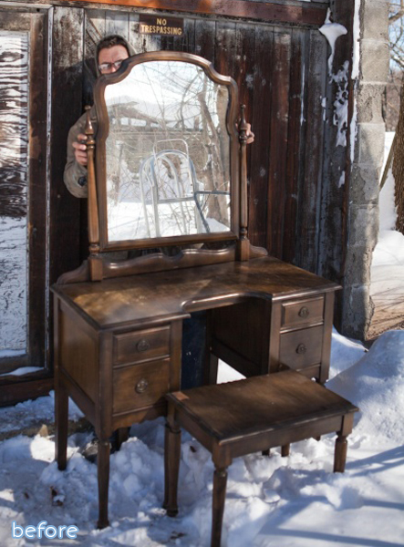 And finally, last one from Sarah who brings us this charming vanity makeover, and her lovely assistant who is lurking not at all creepy-like behind it. I’m kidding. I’m sure he’s a very nice and helpful guy and not going to tie you up with that garden hose. No seriously. I’m sure he’s very nice. This is just what you get when I write posts at 1AM in the AM.