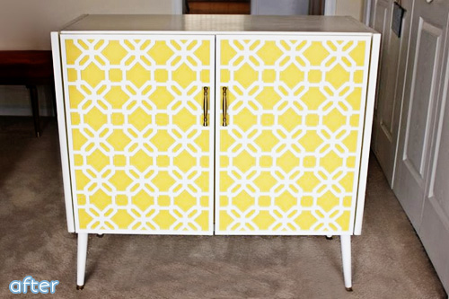 Cabinets without feet are sad. Most things without feet are sad. Except dolphins. They don’t have feet, and they aren’t sad at all – just evil. I said it. But this cabinet was looking a little glum in it its footless state, so Lisa added some cheer with bright yellow, a geometric overlay, and new feetsies. See it at Sweet Parsley Home.