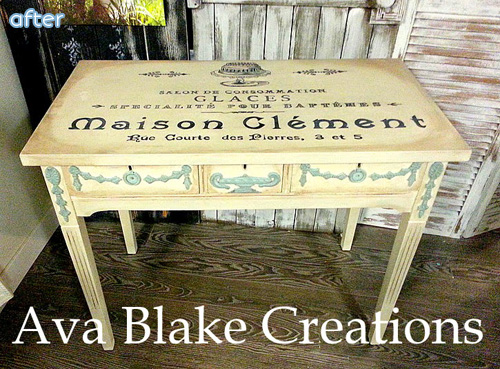 Jenny at Ava Blake Creations dolled up this table with some distressing and a French patisserie graphic, all warmed up in a soft buttery shade of yellow. Tres chic!