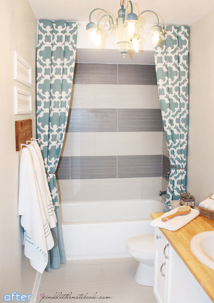 Stop it right now! Your bathroom IS a total babe. You just have to dress it right. Instead of one wimpy little shower curtain that only emphasizes how low and boxy the shower is, Sabrina chose a double curtain design that goes all the way up to the ceiling! High drama! High style! This bathroom is getting asked out on a date tonight!