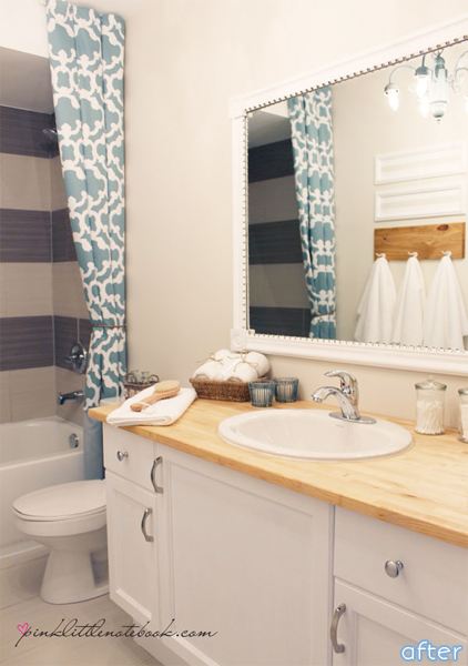 Of course, the new tile doesn’t hurt either. I also love the butcher block countertop, not a typical choice for a bathroom, but I think it really adds a lot of warmth to the room. Fabulous!