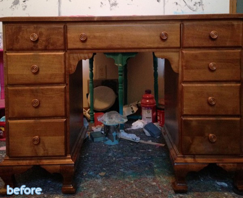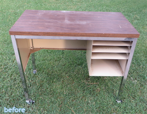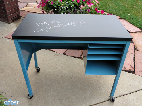 If you answered mostly A’s, then you may enjoy this industrial school-house style desk that Beck rescued from beige oblivion. She covered the formica top with a coat of chalkboard paint, and it’s ready to roll straight into your heart on those cute little casters. See it at Beckwith’s Treasures.