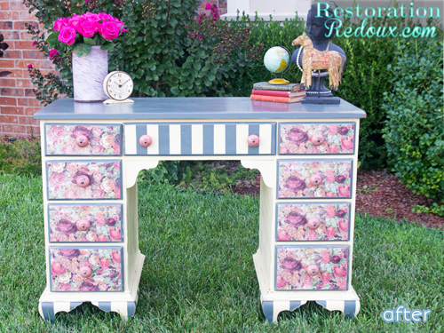 If you answered mostly B’s, then nothing is too girlishly garnished for you. Get a load of this decoupaged desk that Shanna at Restoration Redoux covered with a unapologetically glamorous rose print. It belongs in your boudoir, dahling.
