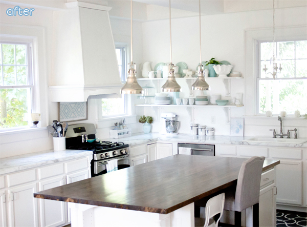 And now, fabulous makeover time! Amber was not going to put up with this fruit-festooned kitchen any longer. She took a baseball bat to it and tore it down to the studs. I’m not sure if that’s exactly what happened, but I see a baseball bat in the picture, so I’m about 99% sure.