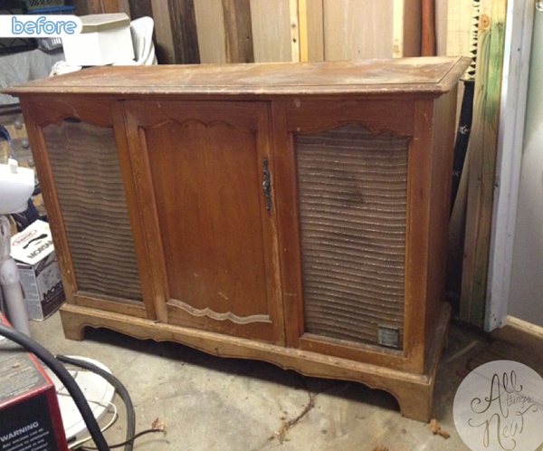 Annnnnnyway, this next console actually began life as a sophisticated stereo system, decades ago. However, it was most recently suffering in the garage as a workbench with a drillpress screwed to the top! Oh honey no.
