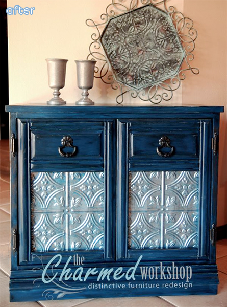 This little cabinet also hopped aboard the metal trend train when Kellee outfitted it with embossed tin panels. She was going for a distressed look, so she lowered the shine of the tin by rubbing in some of the same midnight blue paint used to paint the piece, then glazed it all with black stain for extra drama. How fortuitous that the old handles complement the design on the new tin so well!