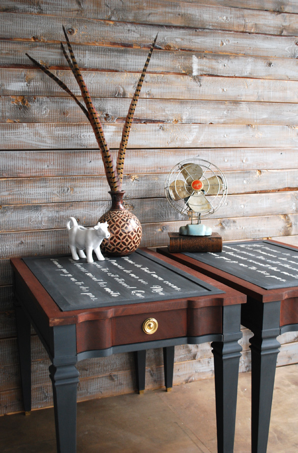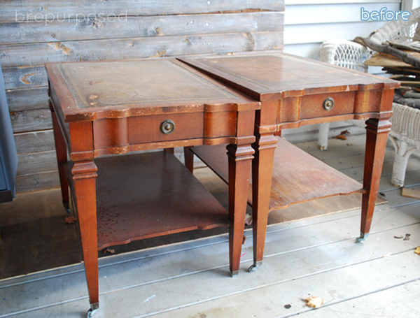 So let’s get down and dirty with a few full-bodied makeovers today, starting with these side tables from Bre. She tore off the old leather of nastiness and used an adorable french stencil in its place, along with a two-tone paint job that screams sophistication. But y’know, sophisticatedly.