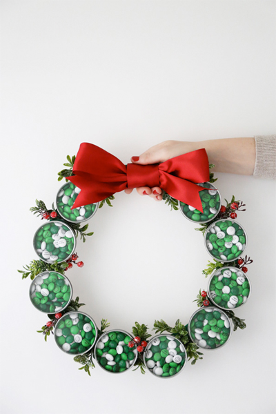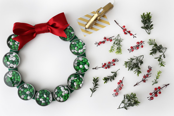 Attach magnets to the wreath form, then stick these candy tin sets right to the magnets.