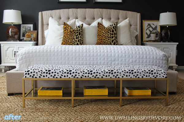So she hacked this IKEA table, which was the perfect size for some end-of-the-bed-bench-age. She simply swapped the glass on top for the wooden shelf on the bottom, upholstered it with fun dalmatian print fabric, and painted it gold. Gorgeous. I know I say this all the time, but I am for sure making this one.
