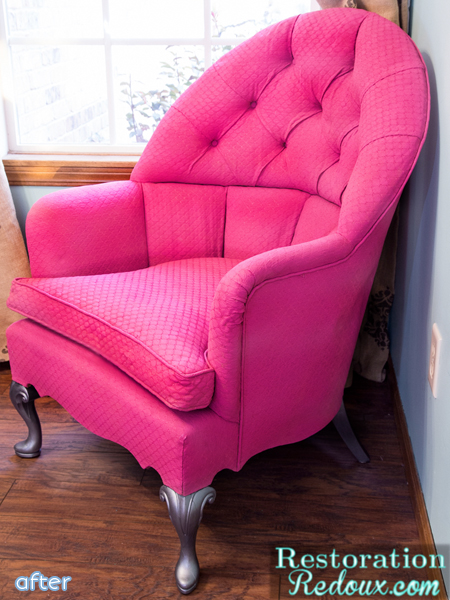 And finally we have Sassy Spice. What else can you call a chair that’s been doused in hot pink paint? That’s right, paint! No upholstery skillz needed here. Shanna used several coats of plaster paint to achieve this look.