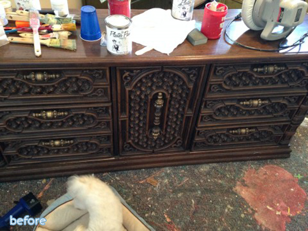 This next dresser was a Craigslist score, bought on the cheap from a college kid who was moving and needed to unload it fast. Despite being a solid vintage piece, the veneer was badly damaged, so Erin didn’t feel too guilty about painting it.