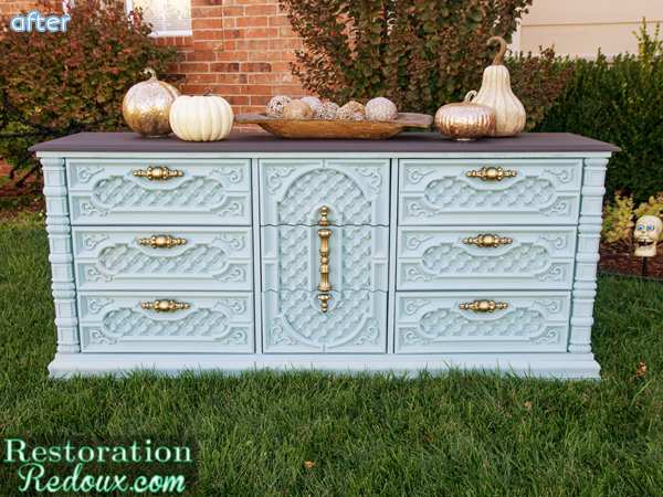So here is some blue coming atcha, starting with Shanna’s plaster painted dresser. Formerly an overwrought disaster, it looks gorgeous glammed up in a light blue-green shade called Seaside.